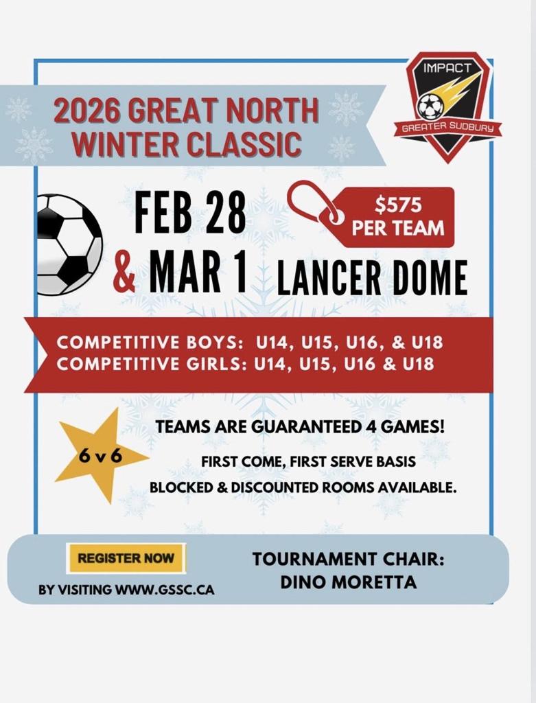 Sign up now for the 2026 Great North Winter Classic brought to you by the Greater Sudbury Soccer Club. The event will be held at the Lancer Dome in Sudbury on February 28th and March 1st.